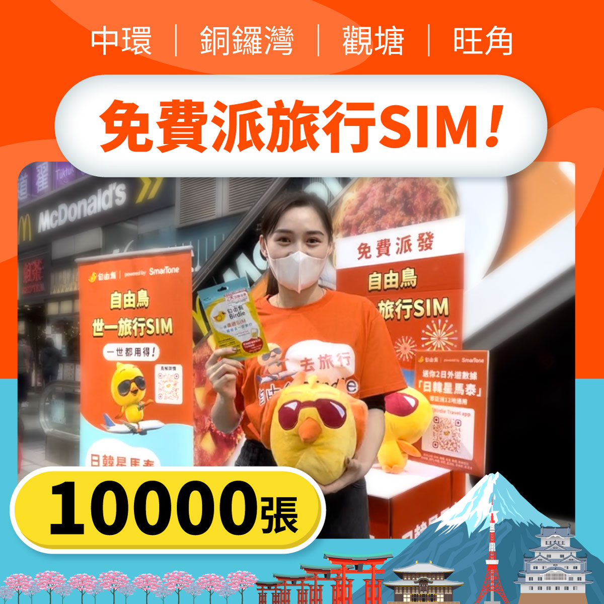 【好緊火呀🔥旅行我來鳥!】嚟緊幾日我會現身港九各區🐥,免費勁派過萬張旅行SIM連亞洲外遊數據日費,去日本🇯🇵,韓國 泰國通通都用得 🤩!地方的Birdie需要愛💓,愛我變成用我!嚟緊去旅行記得帶埋我同你環遊世界呀✈️🌎